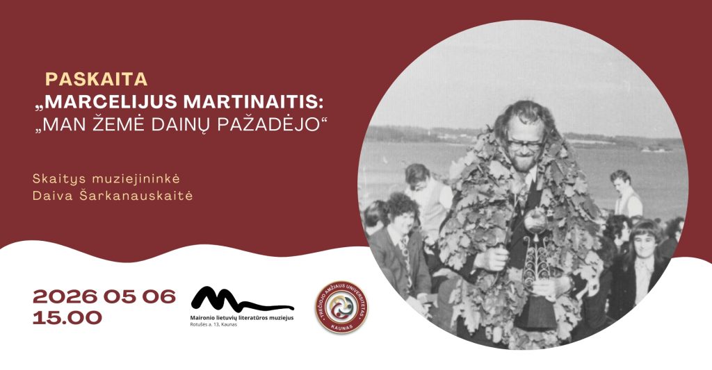 Gegužės 6 d., trečiadienį, 15 val. TAU Literatūros fakulteto klausytojus ir visus, besidominčius literatūra, kviečiame į paskaitą „Marcelijus Martinaitis: „man žemė dainų pažadėjo“. Skaitys muziejininkė Daiva Šarkanauskaitė.